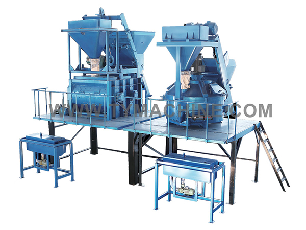 1.配料機 2.底料攪拌機 3.面料攪拌機 4.水泥計量 5.螺旋輸送機 6.水泥倉 7.皮帶輸送機 8.砌塊成型機 9.分屋布料裝置 10.砌塊輸送